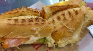 Ternera en pan artesanal con sésamo, lechuga, tomate, aguacate, plátano con papas paja y mojo
