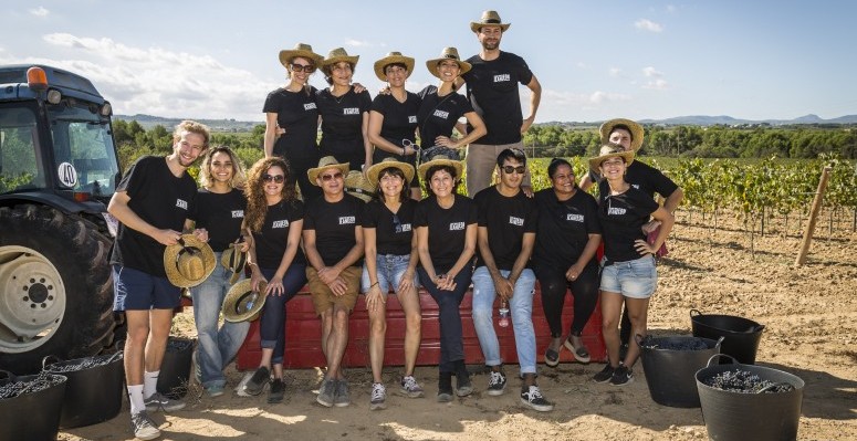 La jornada empezó a las 10h de la mañana con un desayuno de payés en Jean Leon. Una vez desayunados y equipados con sombreros de paja y tijeras, los invitados fueron al viñedo a vendimiar la uva de la variedad petit verdot y después participaron en el tradicional concurso de vendimiadores, donde gana el equipo que más mosto obtiene pisando la uva en un tiempo limitado.