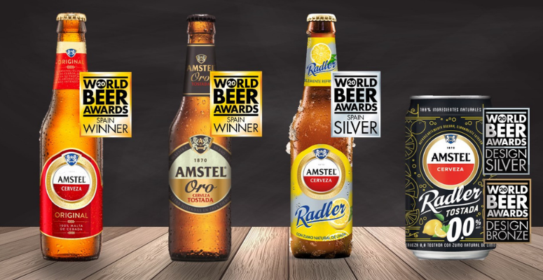 Los World Beer Awards han reconocido la calidad cervecera de Amstel, que este año es la marca más premiada del certamen, acumulando cinco galardones en las categorías de sabor (3 premios) y diseño (2 premios). En concreto, Amstel Oro ha sido reconocida en la categoría International Lager como la mejor cerveza de España. Esta variedad de Amstel es 100% malta, con un contenido alcohólico de 6,2 % en volumen, con una cuidadosa mezcla de maltas, con diferentes niveles de tueste que le confiere un color dorado oscuro y un particular aroma a malta tostada. El resultado es una cerveza con cuerpo, cremosa espuma, sabor intenso y el punto justo de amargor.