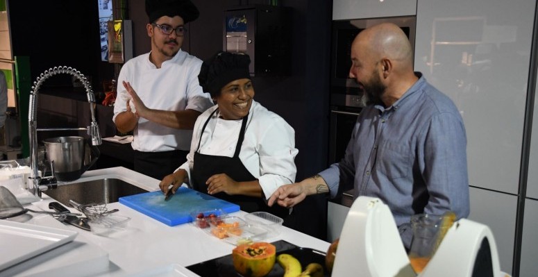 De esta manera, tuvo lugar el primer de los showcookings programados a cargo del profesor Octavio González, docente responsable de Pastelería, y los alumnos de segundo curso del Hotel Escuela Santa Brígida, quienes deleitaron a un joven público que disfrutaron con la elaboración de un ‘Bizcocho de plátano y yogur con chocolate blanco y cereales’, ‘Tartaleta rellena de crema y frutas de temporada’, ‘Buñuelo relleno de crema de Gofio’ y un ‘Smothie de manga, papaya y zanahoria’.