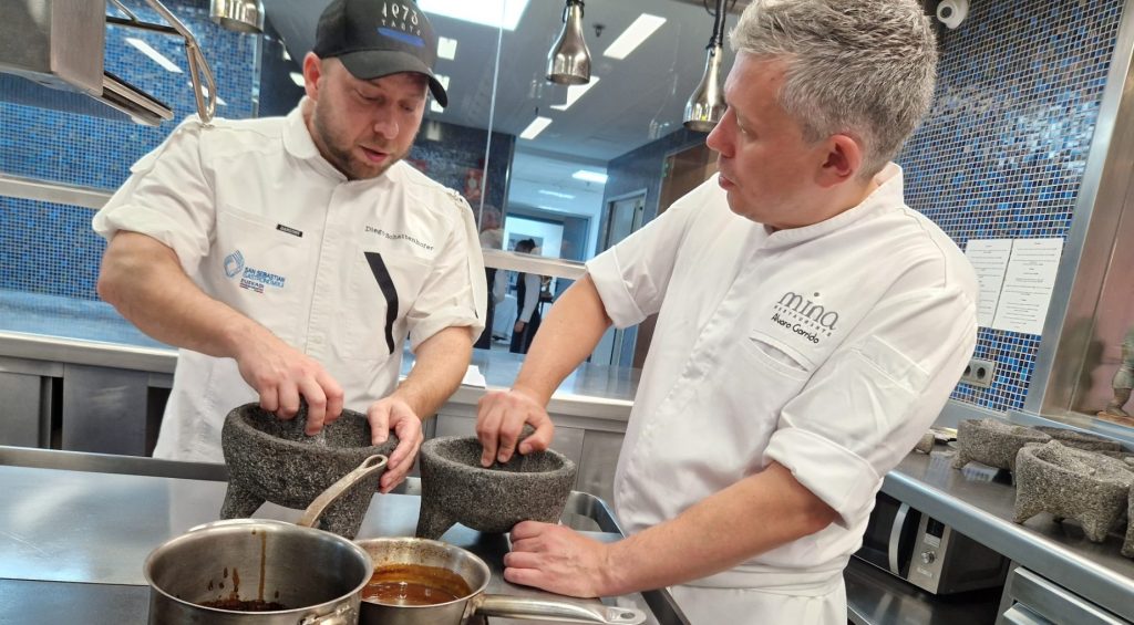 El acontecimiento bien lo valía. El cromatismo del menú, colisión incruenta entre el Cantábrico de Garrido (que se trajo todas las materias primas de Bilbao) y el Atlántico aborigen y vanguardista de Schattenhofer, transitó por exquisiteces durante sus 14 pases. Asombroso fue el centelleante pica pica inicial (papas miméticas, atún con caviar y pulpo), la sopa de txangurro con yema en salazón, escamas crujientes y algas marinas; la gamba canaria con lapas guisadas, erizos de Tenerife y mojo hervido de musgo; el chicharro ahumado con crema de coliflor y encurtidos; el arroz marino con longorón de Canarias y brotes de tierras marinas; el bonito del norte confitado con jugo de sus espinas y esencia de piparras; el candil de profundidad de El Hierro, guiso marino y toques de mojos cítricos; las cocochas de bacalao con jugo de berberechos; la carne cabra «Homenaje a nuestros cabreros» (para este plato, los comensales elaboraron personalmente en directo en la mesa, con grandes morteros de piedra volcánica, el mojo rojo); la papada de “Euskal Txerria” confitada con cigala; la cata de queso vertical Fuente de la Tosca; el sorbete de yoghourt de cabra con escamas de gofio, algas y crema de hojas de ficoide glacial; y los “petits fours”.