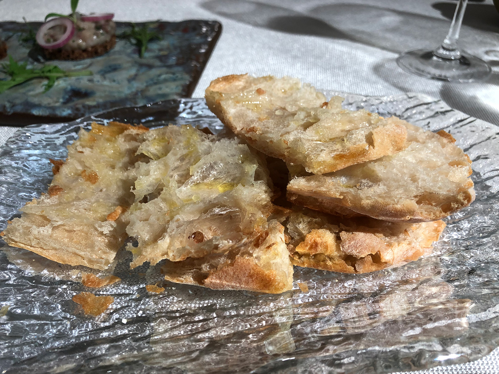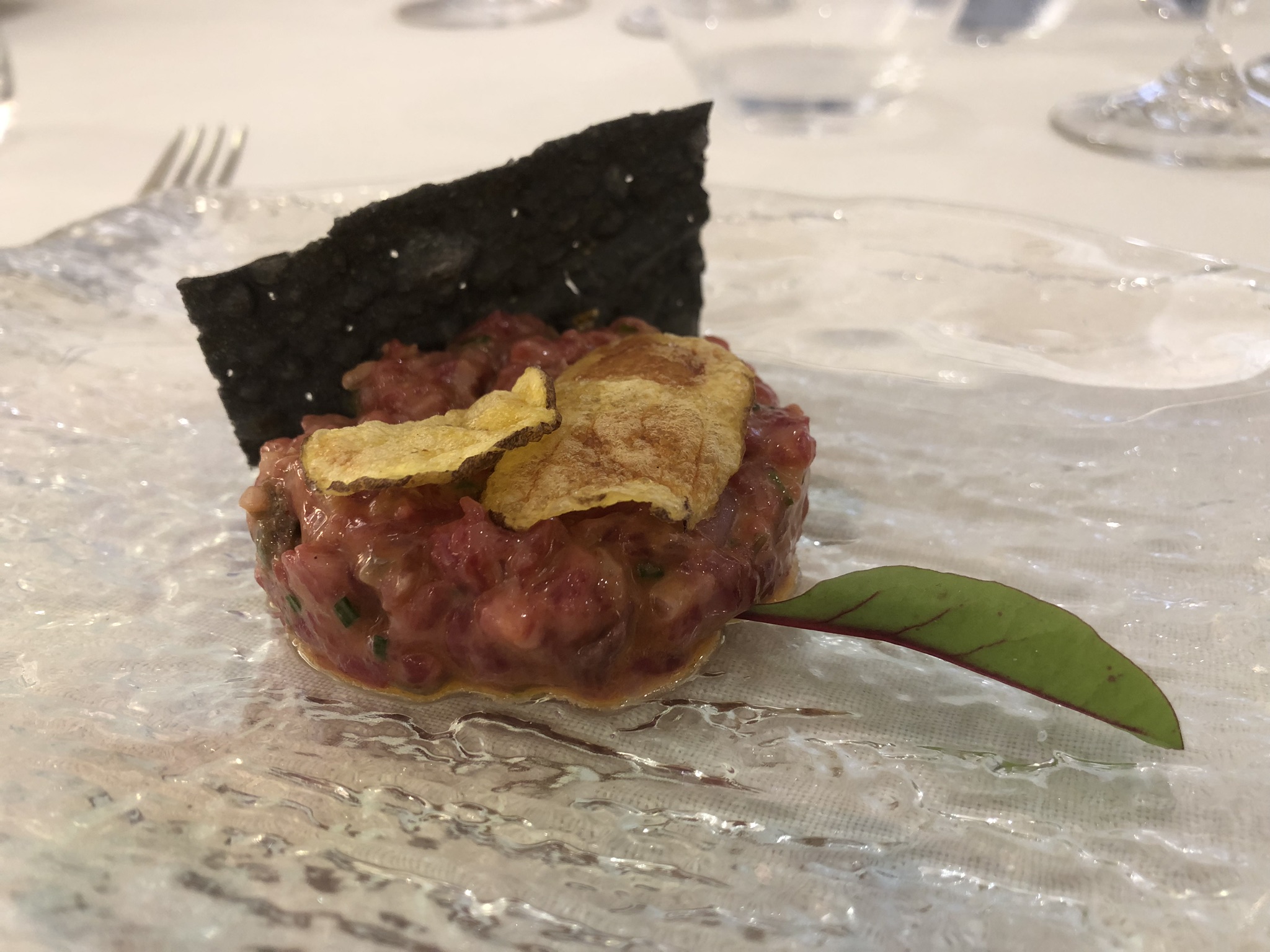 Con el ya tradicional y casi exclusivo Pan de Cristal del establecimiento, comenzó el “tour gastronómico” con un Capuchino de crema de marisco, para abrir boca, al que siguió un exquisito Mi cuit de foie gras con reducción de cassis crujiente de miel con sirope de pacharán y, seguidamente, el ya emblemático Nielsen’s steaktartar de Waygu, al que Danny siempre da su punto de picante.