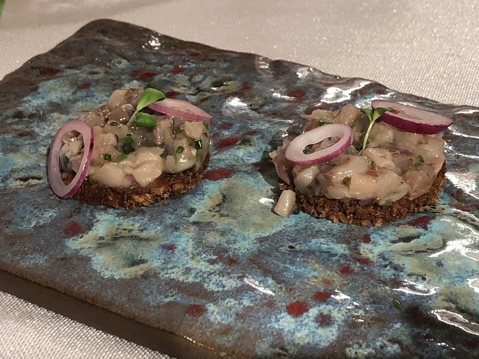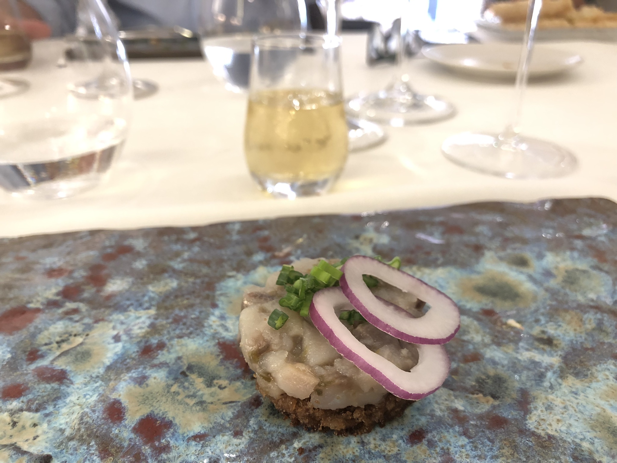 Continuó el menú con otro de los platos que son seña de identidad del NIELSEN Restaurante, como es el Tartar de arenque agridulce con alcaparras y cebolla roja, sobre pan de centeno, que Danny Nielsen borda recordando la tierra de sus orígenes. Para maridar el mismo se sirvió en su perfecto punto de frio un Jubilaeum akvavit, destilado en Aalborg (Dinamarca).
