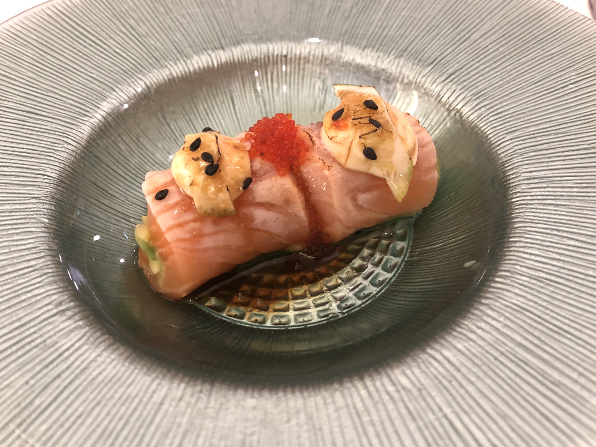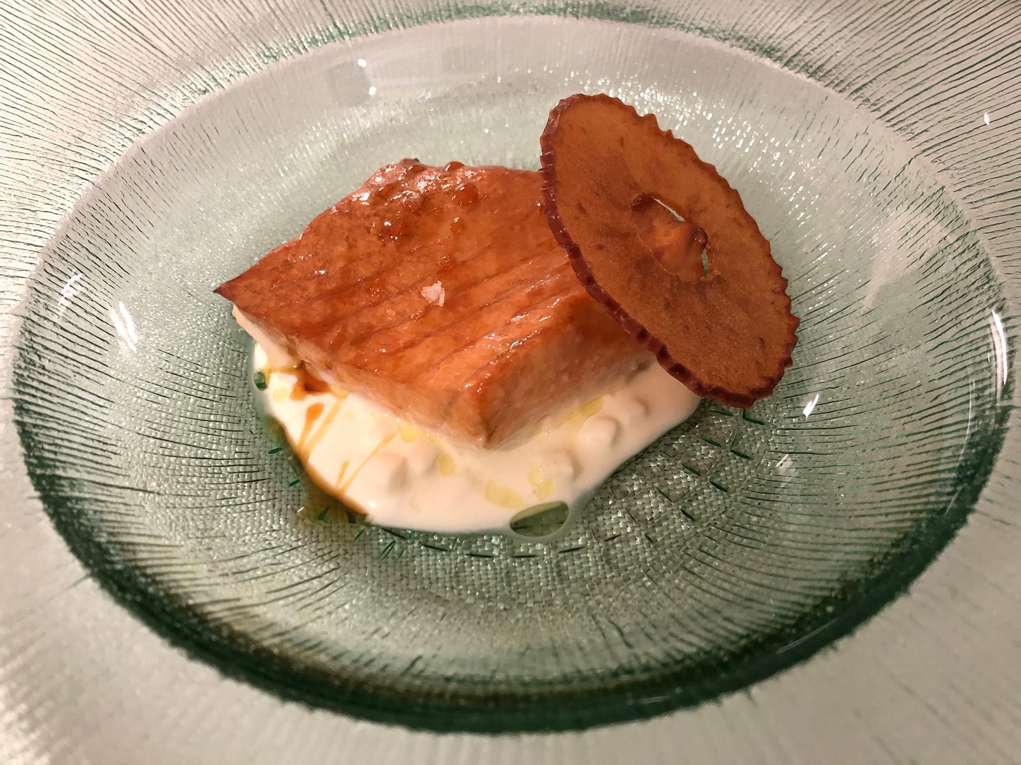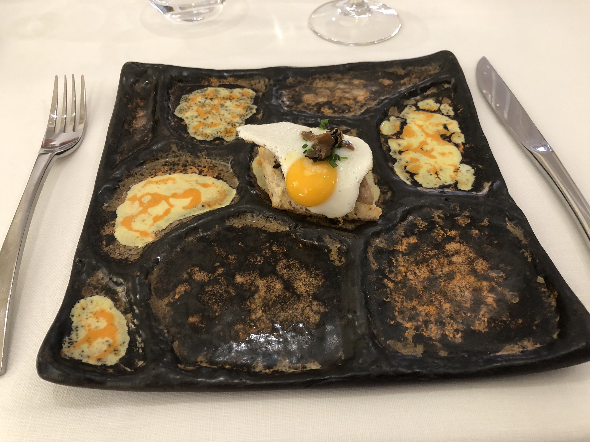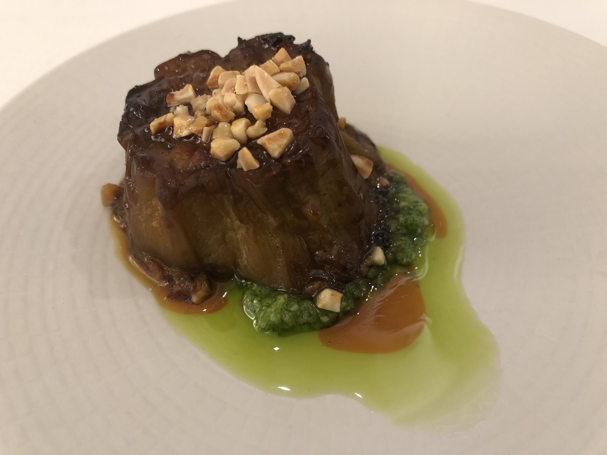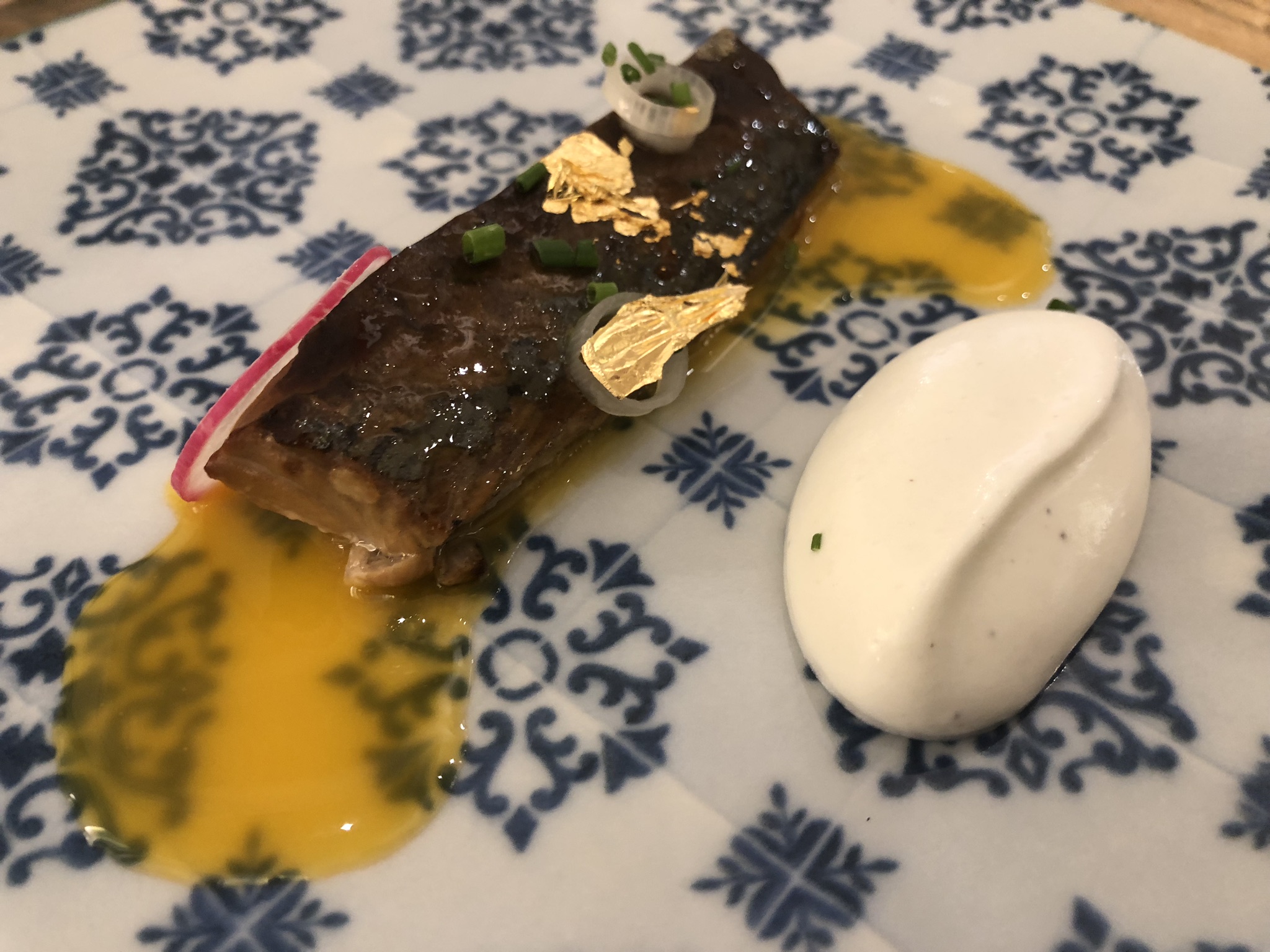 Pasamos seguidamente a un Rollito de salmón con aguacate, almendras y huevas de pez volador, que dio paso a una Tosta de anguila ahumada con muselina de setas, huevo frito de codorniz y trufa, a la que siguió una Caballa ahumada con yema de huevo, rábano picante y fantasía de oro comestible, para terminar con una Berenjena al horno con pesto de cebolleta y ajos tiernos.