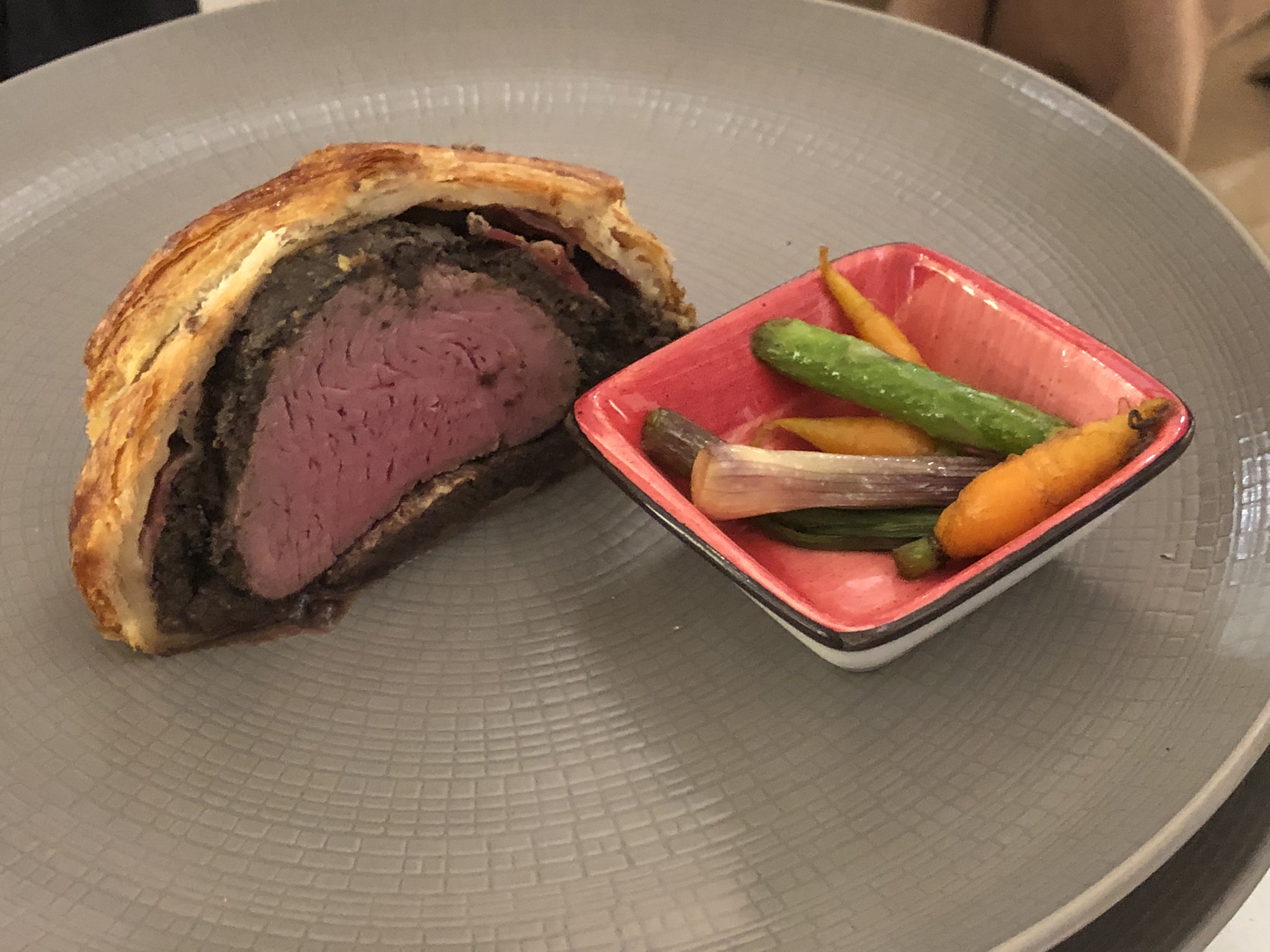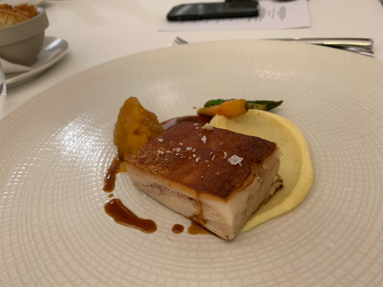 En este punto del menú, se ofreció a los comensales optar por uno de los siguientes tres platos, a cual más exquisito: el primero, un también ya popularizado Salmón ahumado en caliente con crema fresca, aceite de eneldo y verduritas de Guía de Isora, que Danny Nielsen elabora en el momento utilizando un original y veterano ahumador que le regaló su madre; el segundo, Cochinillo confitado con compota de manzana y parchita; y el tercero, un sublime Solomillo “Wellington” (solomillo de res con setas, mostaza, jamón serrano y envuelto en hojaldre) que el NIELSEN Restaurante ofrece a su clientela todos los jueves (o por encargo) y que, en esta ocasión, fue trinchado ante los comensales por Aniceto Manotas Samaniego, nuevo y profesional Jefe de Sala del NIELSEN