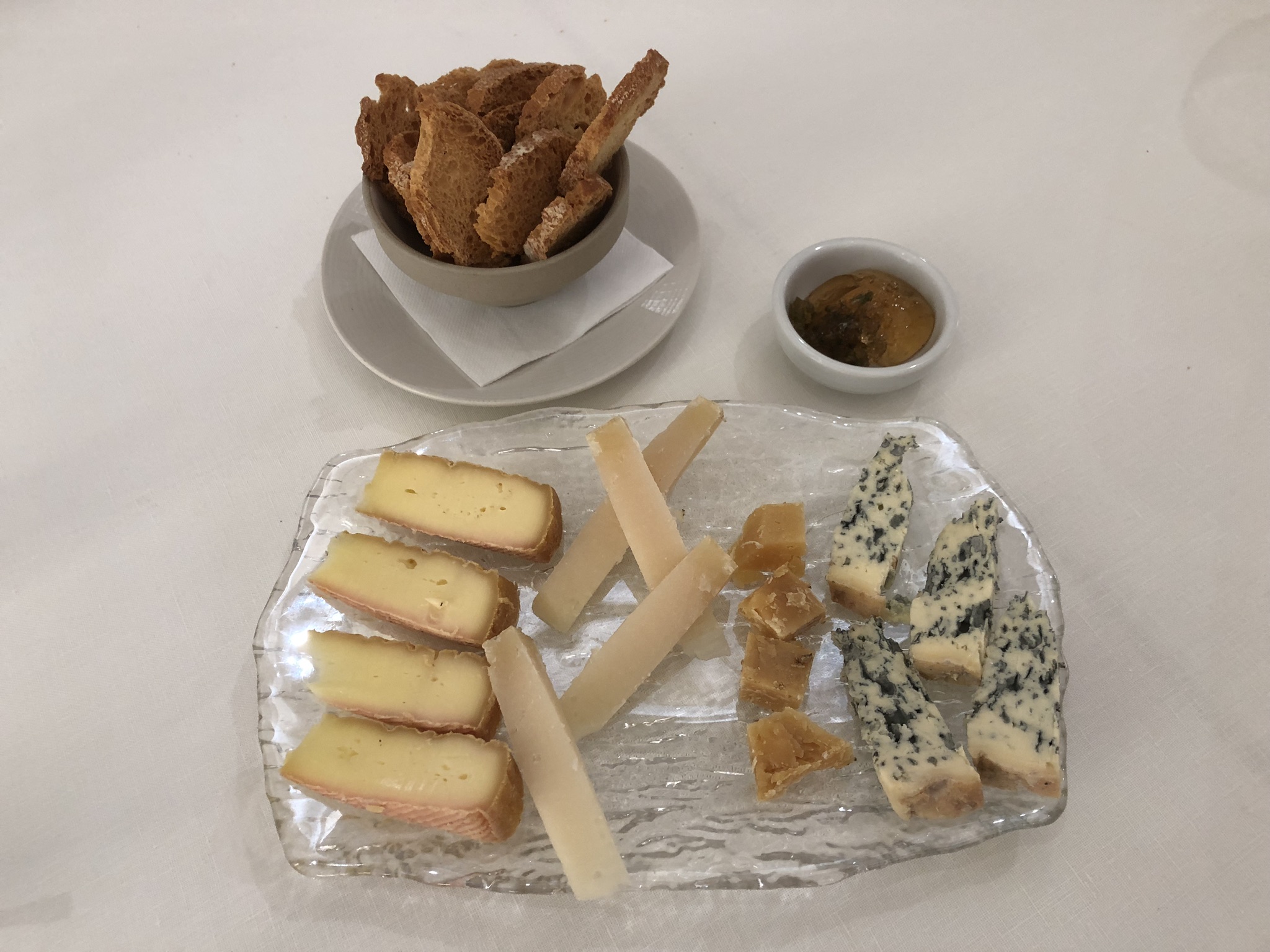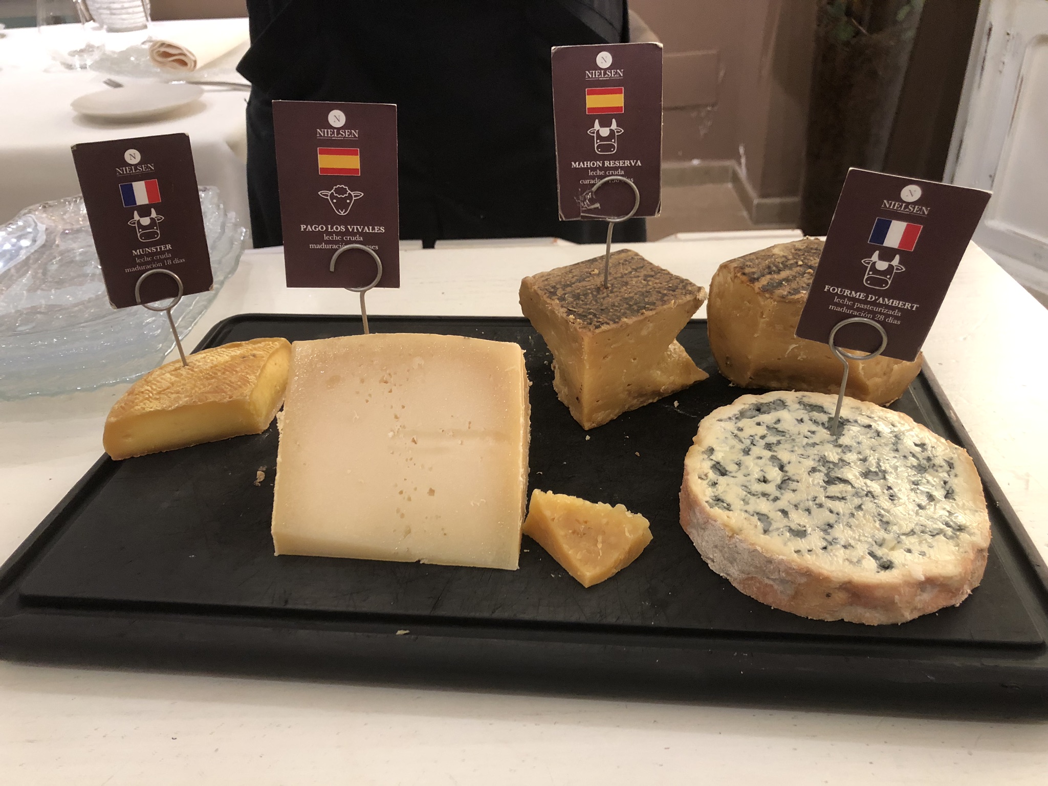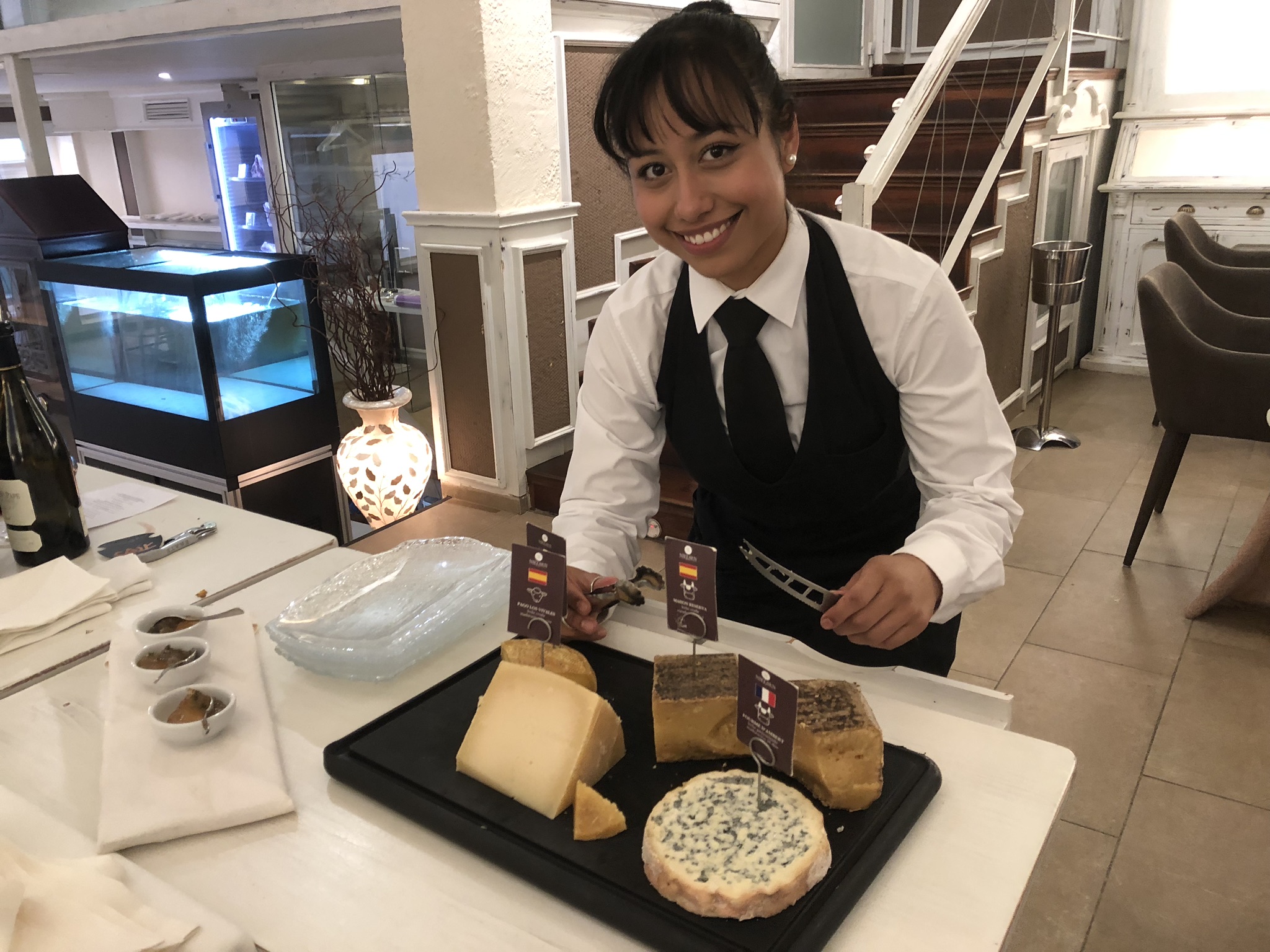 Un fresco y “desengrasante” Sorbete de Aperol Spritz dio paso a una selección de quesos sabiamente elegidos Daniela Salazar, una gran profesional de México, nacida en Guadalajara (Jalisco) que es auténtica puntal del servicio de sala del NIELSEN Restaurante y que se ha formado como experta en quesos.