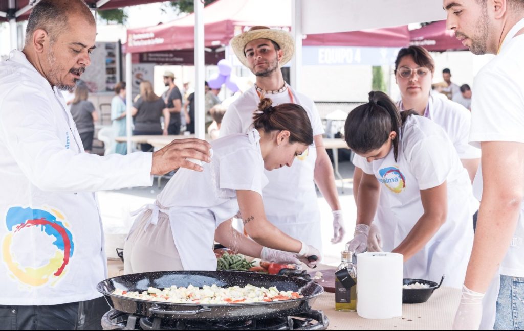 El chef de Cinnamon Bar, Melo Medina, da indicaciones a un grupo de jóvenes mientras preparan un paella