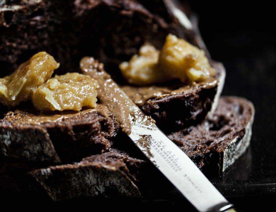 - Tostar una rodaja de pan levain de chocolate ,untarla con el praliné y poner encima los plátanos flambeados.